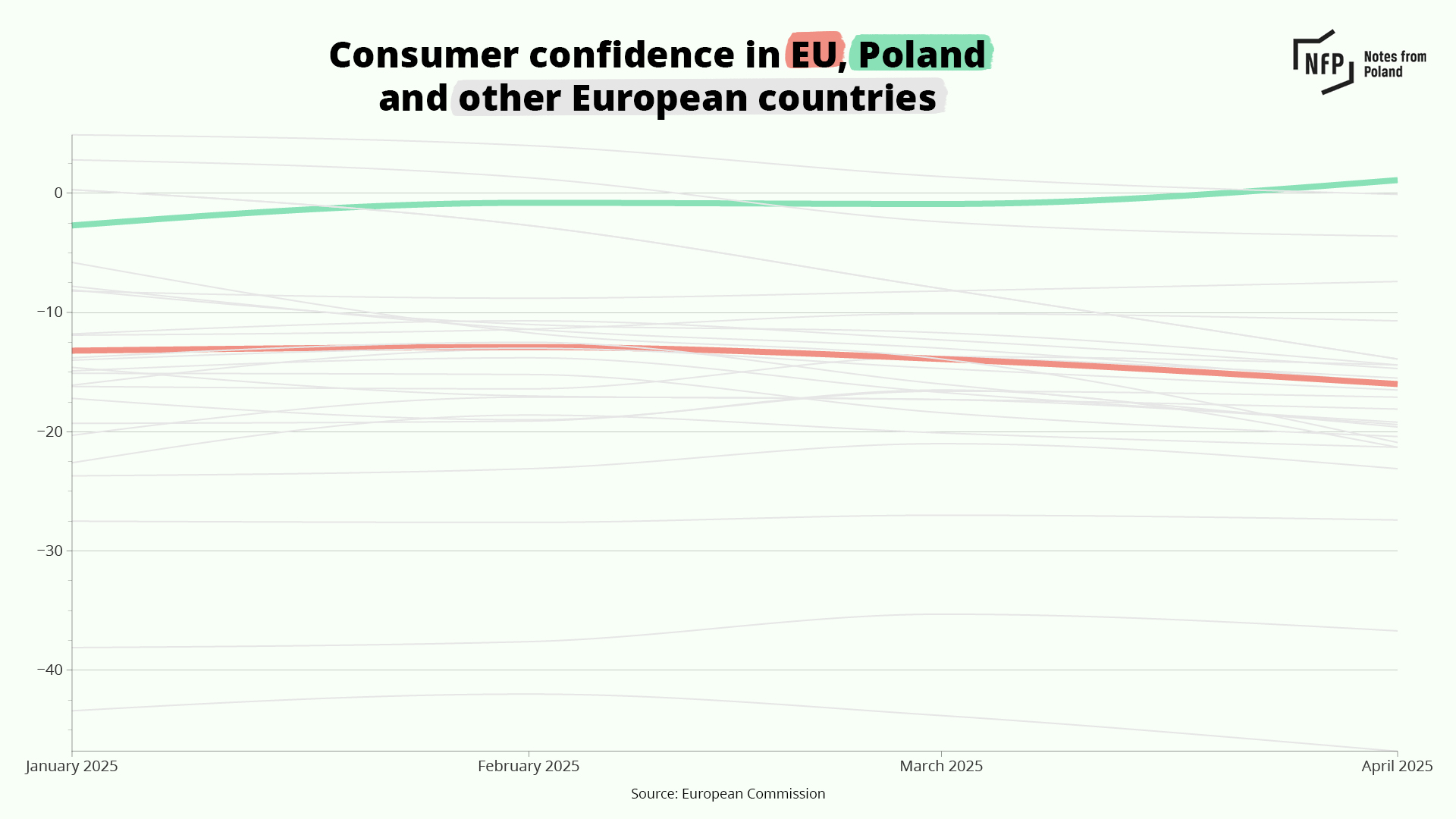 Poland was the only European Union country to record positive consumer sentiment in April. It has also seen the strongest rise in consumer sentiment across the EU this year, setting it apart in a region where confidence broadly declined, driven by mounting concerns over global trade instability and future economic prospects.