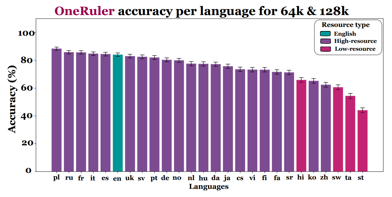 The performance of each language in the most complex tasks (source: “One ruler to measure them all: Benchmarking multilingual long-context language models”, Yekyung Kim, Jenna Russell, Marzena Karpinska, Mohit Iyyer)