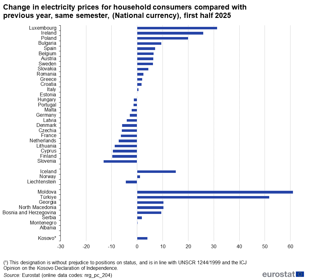 Polish electricity prices were 20% higher in the first half of 2025 than in the same period last year, new data from Eurostat show. Only Luxembourg (+31.3%) and Ireland (+25.9%) recorded bigger increases..