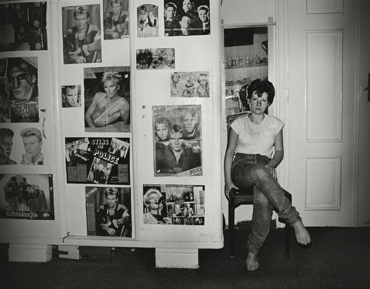 One striking example is a black-and-white photograph of a young woman seated beside a wardrobe plastered with posters of Sting and his rock band The Police. The room is modest, its sparse furniture and plain walls offset by these vivid emblems of Western popular culture.