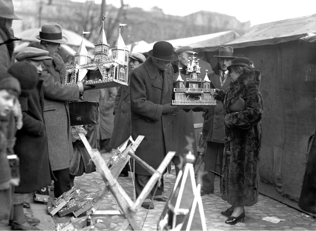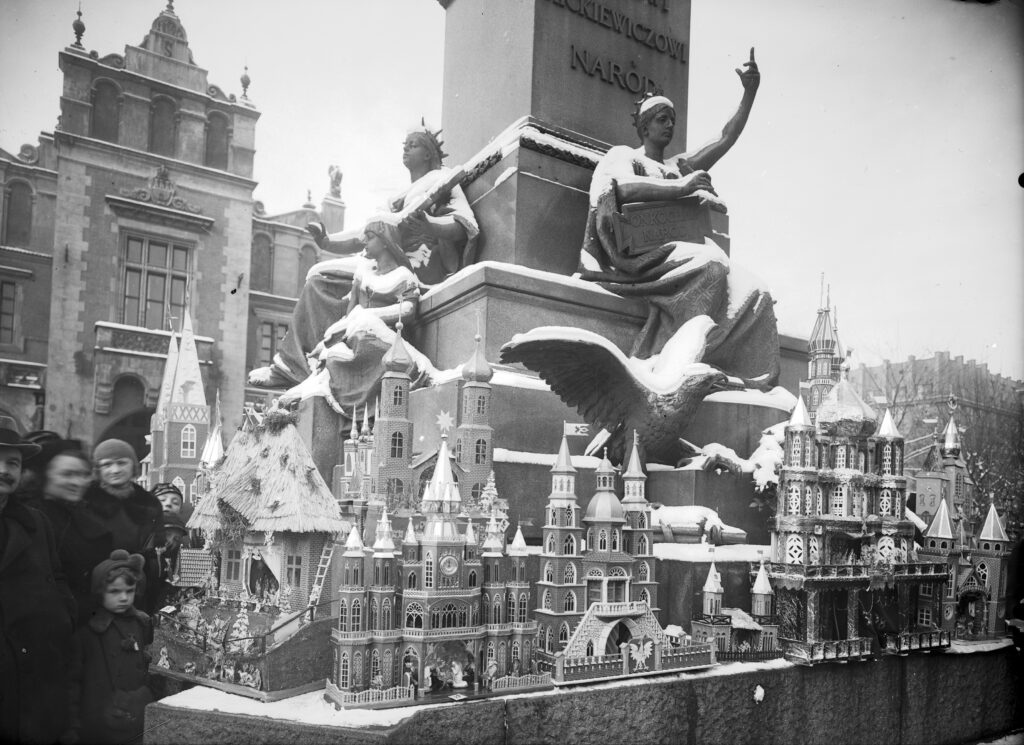 Szopki exhibited at the base of the Adam Mickiewicz monument on Kraków’s Main Market Square during the second edition of the city’s annual nativity scene competition, 1938 (NAC/public domain)