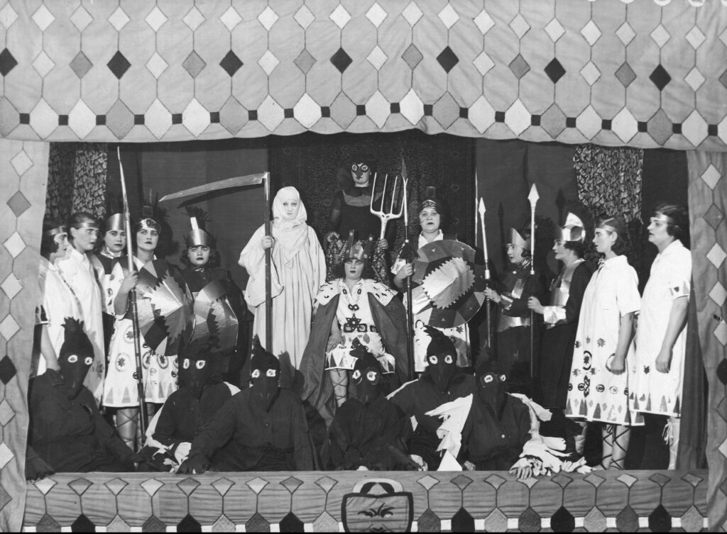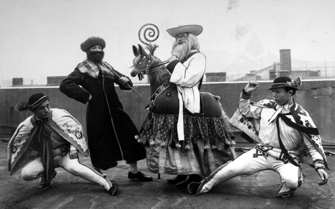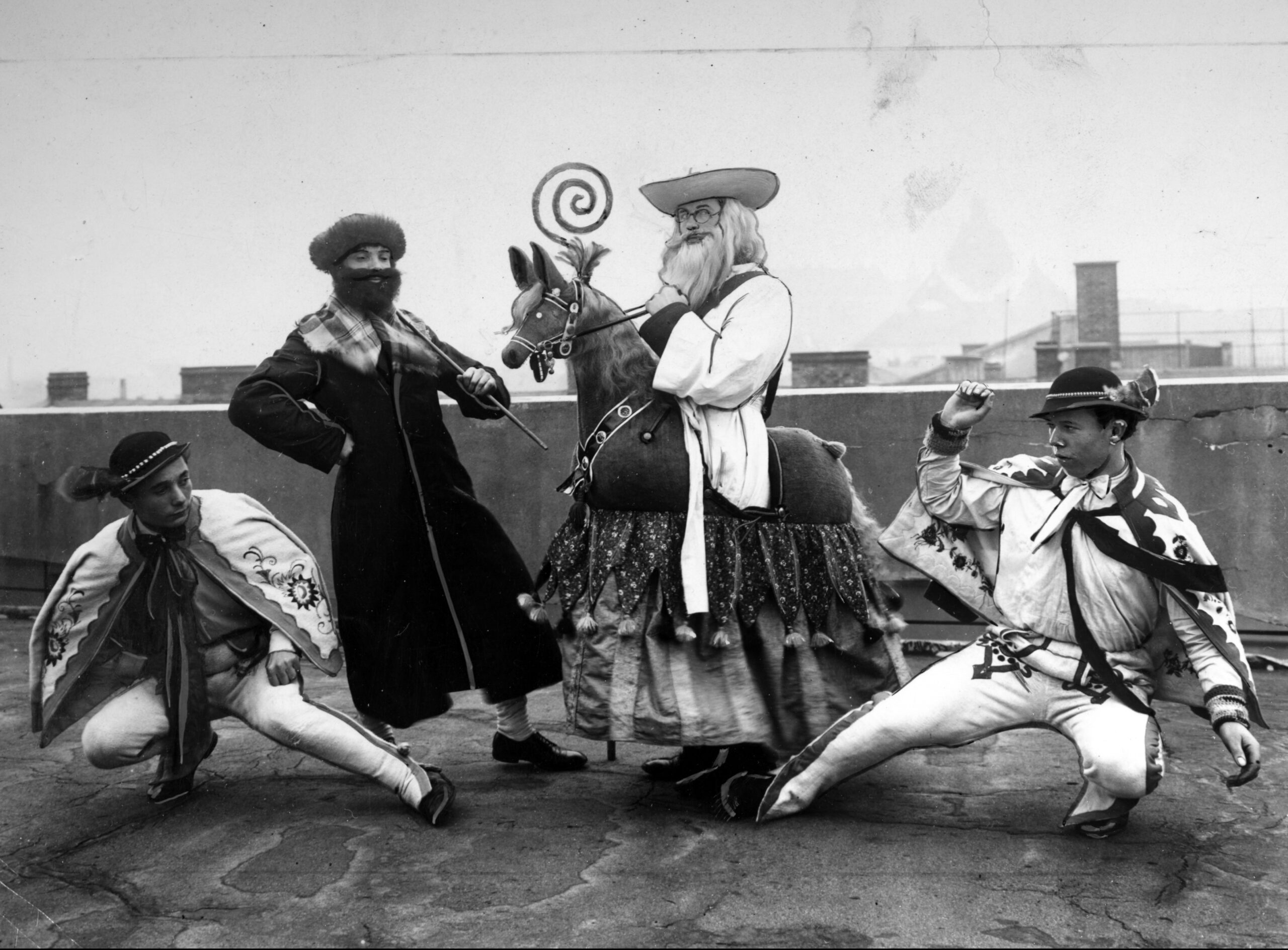 A group of carollers posing on the roof of the Press Palace in Kraków, 1938. Second right is Lajkonik, the bearded man on a hobby horse who is one of the symbols of the city (NAC/public domain)
