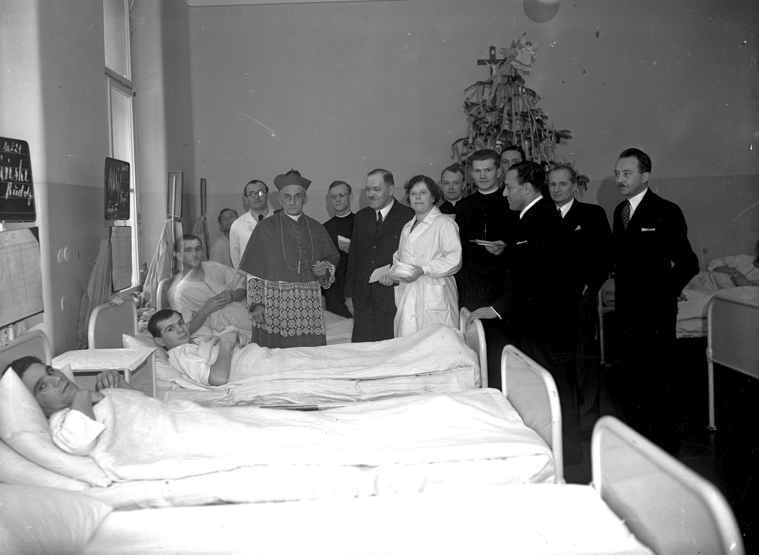 Archbishop of Kraków Adam Sapieha exchanging a Christmas wafer with patients at a hospital in the city, 1937 (NAC/public domain)