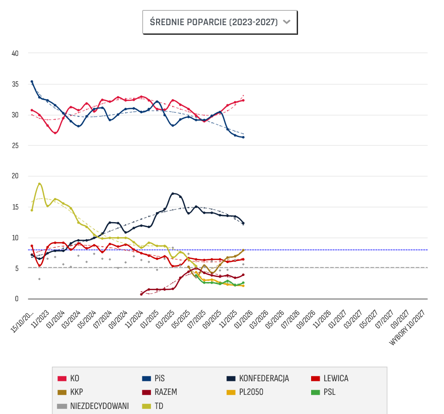 According to the Politico Europe aggregator of Polish opinion polls, PiS saw its support drop from 31% in June to 28% in December, falling behind KO, which is currently averaging 34%.
