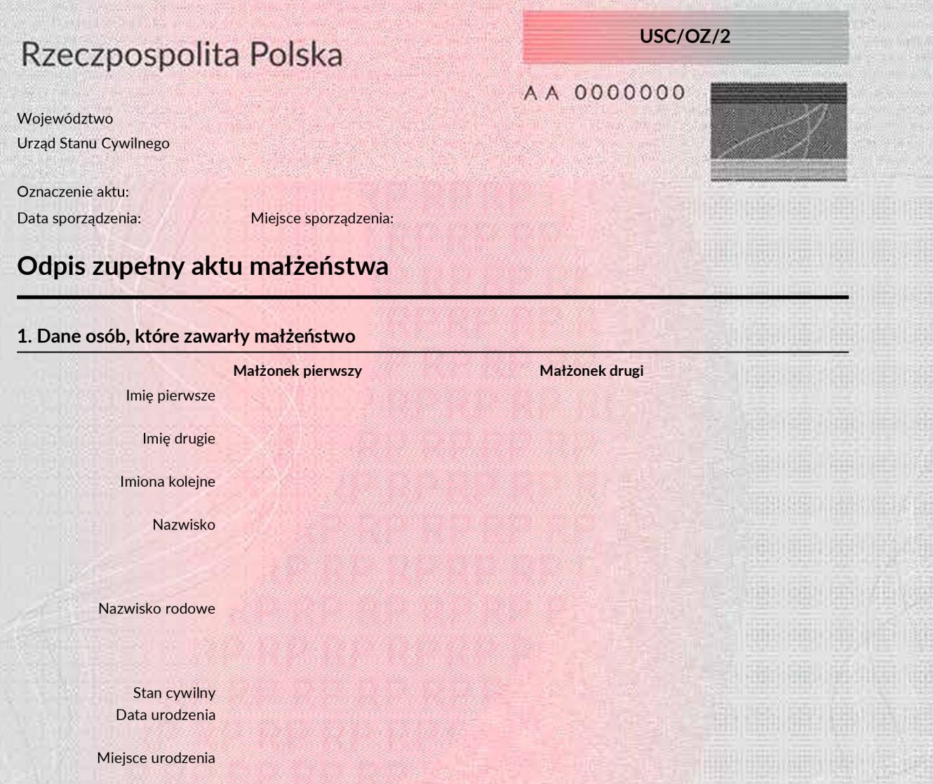 The proposed new look of the form for transcribing foreign marriages, saying “first spouse” (małżonek pierwszy) and “second spouse” (małżonek drugi).