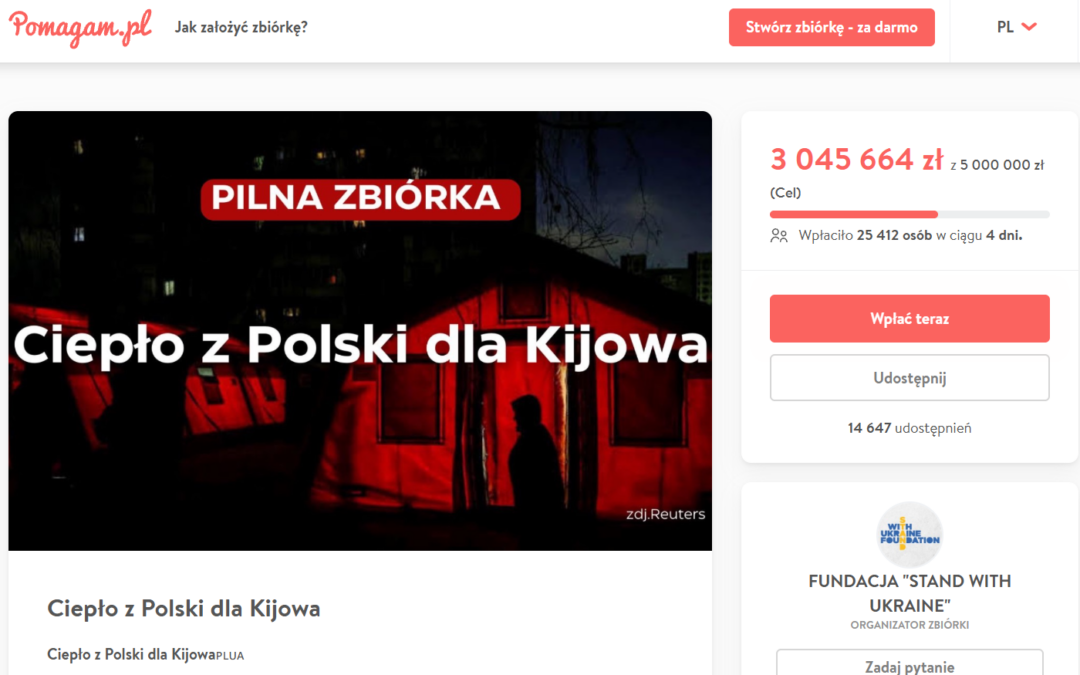 Last week, the Warsaw-based Stand With Ukraine Foundation launched an online fundraiser to purchase power generators for the Ukrainian capital, Kyiv. It initially aimed to raise 1 million zloty, but that target was met within three days.