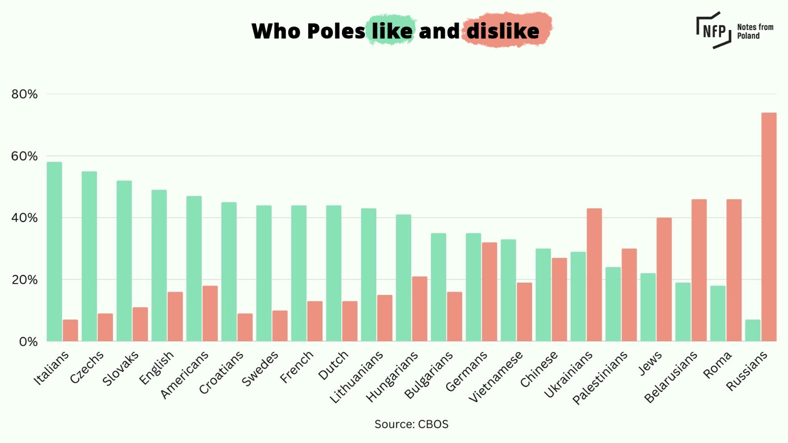 However, Russians, Belarusians and Roma remain the most disliked national and ethnic groups in Poland, while Italians, Czechs and Slovaks are the most popular.