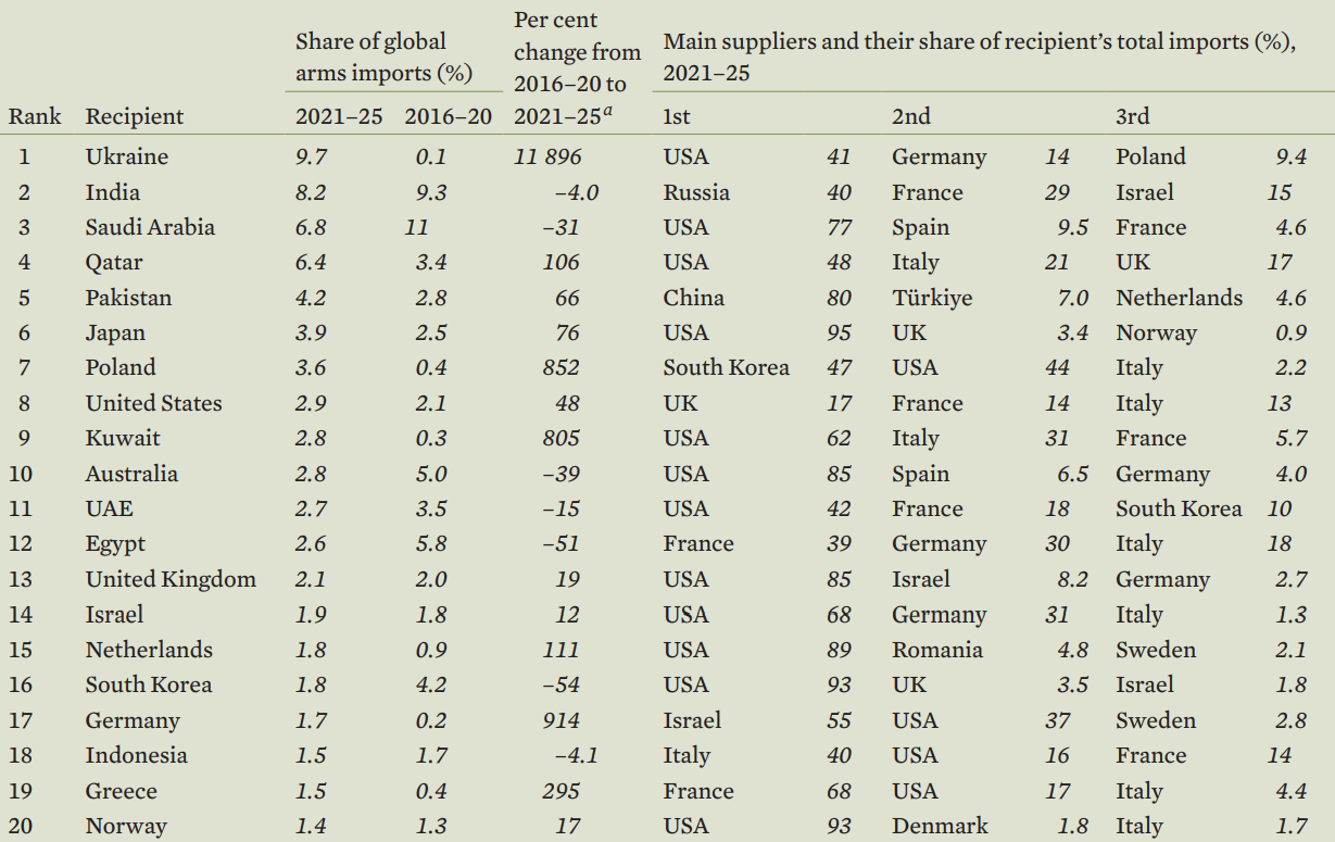 The world’s 20 largest arms importers, 2021-25 (source: Trends in International Arms Transfers, SIPRI)