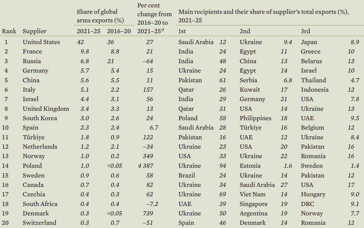 The world’s 20 largest arms exporters, 2021-25 (source: Trends in International Arms Transfers, SIPRI)